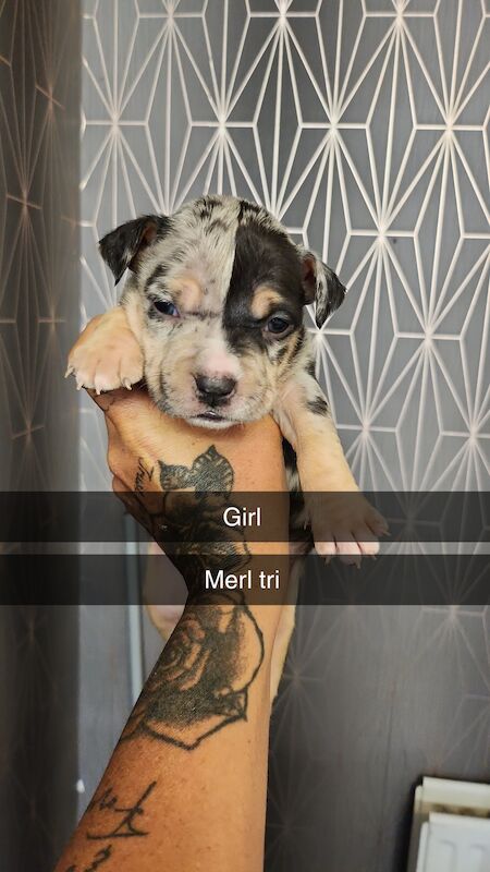 American bully pup (NOT XL) beautiful merle colour looking for a forever home loving and cuddly loves to play with her toys and a good old nap beautiful temperament will make a great companion. Micro chipped Fleed First injection done / second due 1/12/25 So ready to go on or after that date. Can go sooner if buyer want’s to take her for her second injection at Salford pets